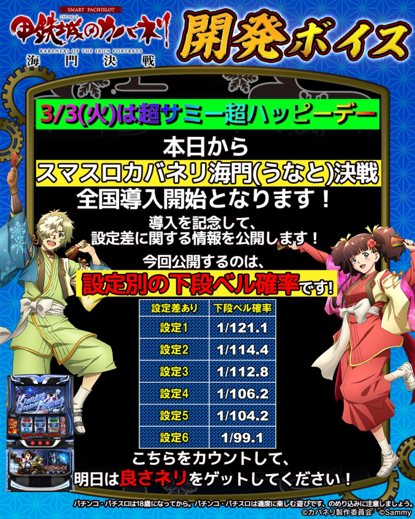 | 発生確率 | 設定1 | 設定2 | 設定3 | 設定4 | 設定5 | 設定6 |